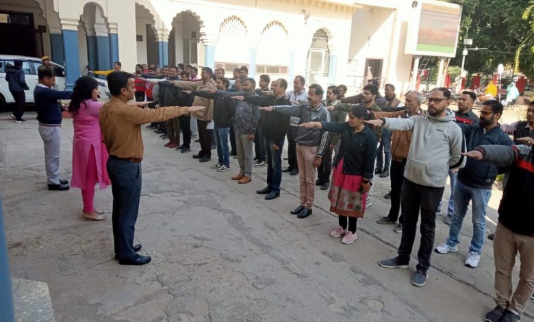 विकसित भारत सकंल्प यात्रा का एक प्रमुख प्रकल्प‘‘ हमारा संकल्प विकसित भारत की शपथ’’ लिया जाने के फलस्वरूप कलेक्ट्रेट के विभिन्न अनुभागो के कार्मिकों एवं विभिन्न विभागों के अधिकारियों एवं कार्मिकों को जिला कलक्टर शुभम चैधरी व अति. जिला कलक्टर डाॅ भास्कर विश्नोई ने शपथ दिलाई ।