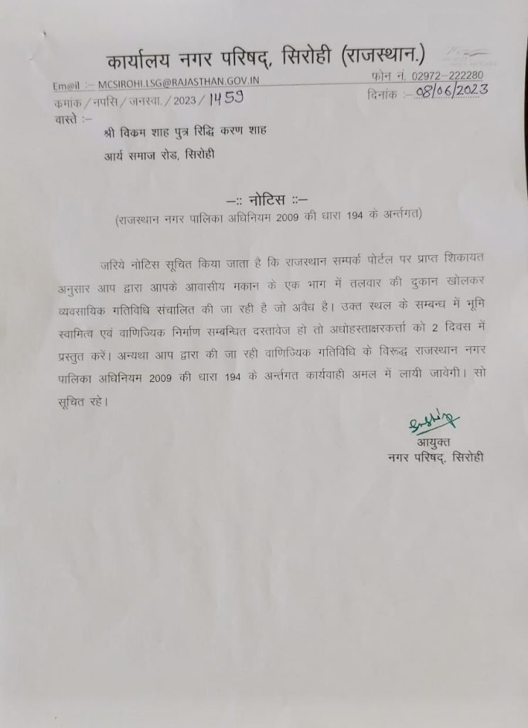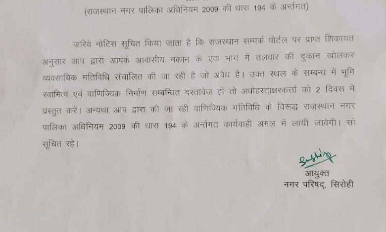 सिरोही। आर्य समाज रोड पर स्थित विक्रम शाह पुत्र रिद्धि करण शाह के मकान के एक भाग में तलवार की दुकान संचालित है। उक्त भूमि बिना वाणिज्य संपरिवर्तन के संचालित है, जिस पर नगर परिषद द्वारा (राजस्थान नगर पालिका अधिनियम 2009 की धारा 194 के अन्तर्गत ) नियम का हवाला देकर नोटिस भी दिया गया। लेकिन आगामी कोई कारवाई अमल में नहीं लाई गई। जिससे मकान मालिक बे खोफ होकर दुकान संचालित कर मोटी मोटी आय का स्रोत बना बैठा है।