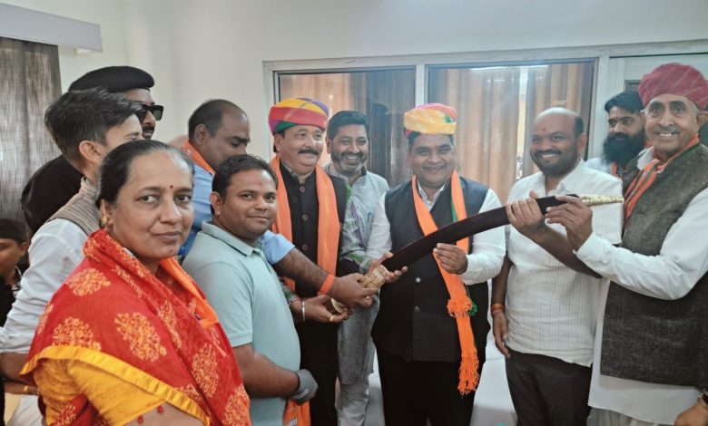 भाजपा नगर मंडल सिरोही की ओर से राज्य मन्त्री को तलवार भेटकर किया स्वागत।