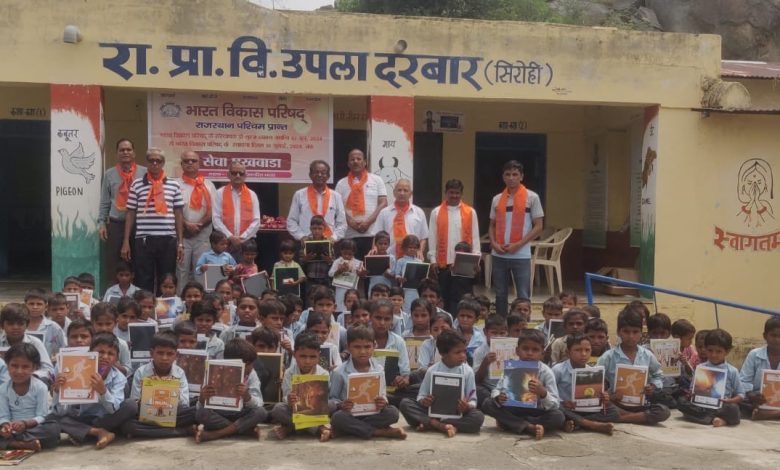 भारत विकास परिषद देव नगरी शाखा सिरोही के सदस्यों द्वारा उपला दरबार एवं मकरोड़ा विद्यालय में विद्यार्थियों को निशुल्क उत्तर पुस्तिकाएं, पेन, पेंसिल एवं स्लेट वितरित की गई । परिषद के सचिव मदन सिंह परमार ने बताया कि सेवा एवं पर्यावरण पखवाड़े के अंतर्गत इस आठवे कार्यक्रम में उपला दरबार प्राथमिक विद्यालय एवं राजकीय उच्च माध्यमिक विद्यालय मांकरोडा में विद्यार्थियों को उत्तर पुस्तिकाएं एवं शिक्षण सामग्री भेंट की गई । साथ ही पर्यावरण जागरूकता अभियान के अंतर्गत विद्यालय परिसर में फल एवं छायादार वृक्ष लगाए गए । इस अवसर पर शाखा अध्यक्ष नरेंद्र पाल सिंह एवं सचिव मदन सिंह परमार ने जीवन में सेवा, संस्कार एवं पर्यावरण के महत्व के विषय मे जागरूक रहने का आह्वान किया ।