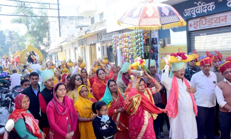 प्रथमेश गार्डन में कथा वाचक कथावाचक भाई श्री संतोष सागर जी व संत वृन्द व यजमान परिवार ने निकाली शोभायात्रा