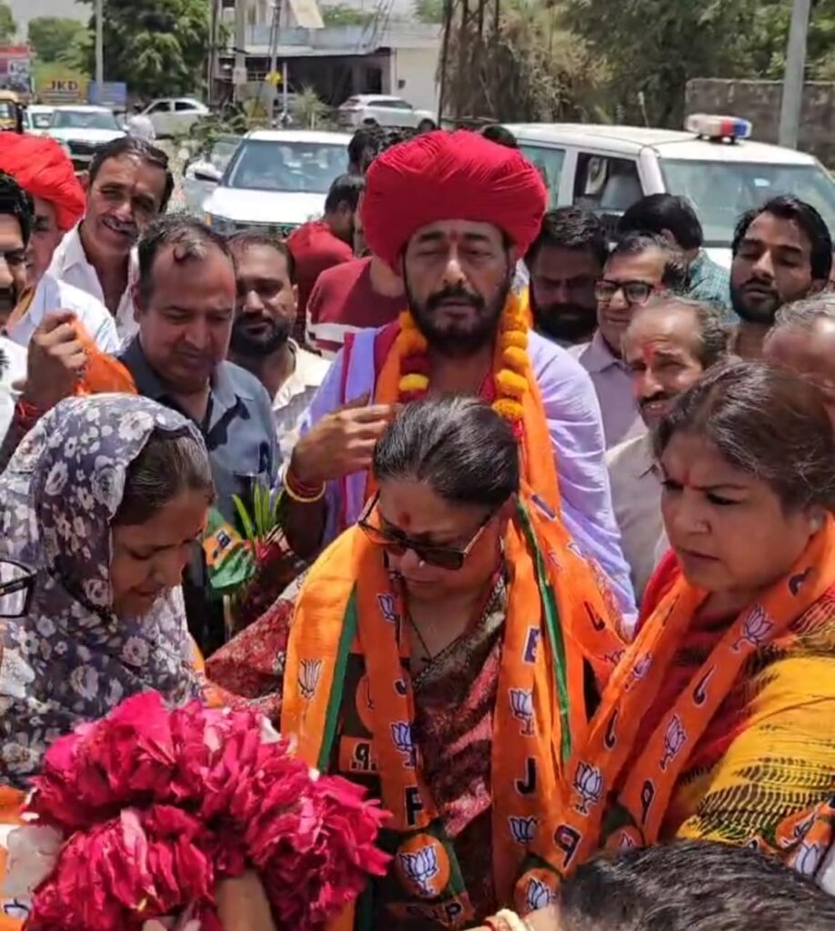 भाजपा जिला प्रवक्ता रोहित खत्री ने बताया कि पूर्व मुख्यमंत्री वसुंधरा राजे का सिरोही जिले में आगमन पर भाजपा पदाधिकारी व कार्यकर्ताओं द्वारा भव्य स्वागत किया गया। सिरोही मुख्यालय पर स्वामीनारायण मंदिर के सामने कैबिनेट मंत्री जोगाराम पटेल ने पूर्व मुख्यमंत्री वसुंधरा राजे का स्वागत किया। भाजपा नगर मंडल के द्वारा सारणेश्वर महादेव की तस्वीर भेटकर स्वागत अभिनंदन किया गया। साथ ही भाजपा पदाधिकारीयों व जनप्रतिनिधियों द्वारा पूर्व मुख्यमंत्री राजे को सिरोही की प्रसिद्ध तलवार भेट की गई है इस मौके पर पूर्व मुख्यमंत्री वसुंधरा राजे स्वागत सत्कार देखकर अभिभूत रही और वरिष्ठ कार्यकर्ताओं का कुशक्षेम पूछी। उसके बाद कृष्णगंज मंडल के द्वारा पूर्व मुख्यमंत्री राजे का कृष्णगंज बस स्टैंड पर भव्य स्वागत रखा गया। कृष्णगंज मंडल द्वारा पूर्व मुख्यमंत्री राजे को चुनरी ओढ़ाकर तलवार भेंट की गई है। सैकड़ो की संख्या में कार्यकर्ताओं को देखकर उनका मन गदगद हो गया औऱ पूर्व मुख्यमंत्री वसुंधरा राजे ने मंडल अध्यक्ष हार्दिक देवासी मंच पर पीठ थपथपाई और उन्होंने मंच से कहा कि कार्यकर्ताओं का स्नेह प्यार देखकर मैं गदगद हुई और यहां से आगे जाने का मन नहीं कर रहा है। उसके बाद अपने निर्धारित कार्यक्रम के लिए रवाना हुई। इस मौके पर पूर्व विधायक जगसी राम कोली, जिला प्रमुख अर्जुनराम पुरोहित, प्रधान हंसमुख मेघवाल, पूर्व उपमंत्री भूपेंद्र देवासी, जिला महामंत्री नरपत सिंह राणावत, किसान मोर्चा प्रदेश उपाध्यक्ष गणपत सिंह राठौड़ सहित भाजपा पदाधिकारी, जनप्रतिनिधि व कार्यकर्ता मौजूद रहे।