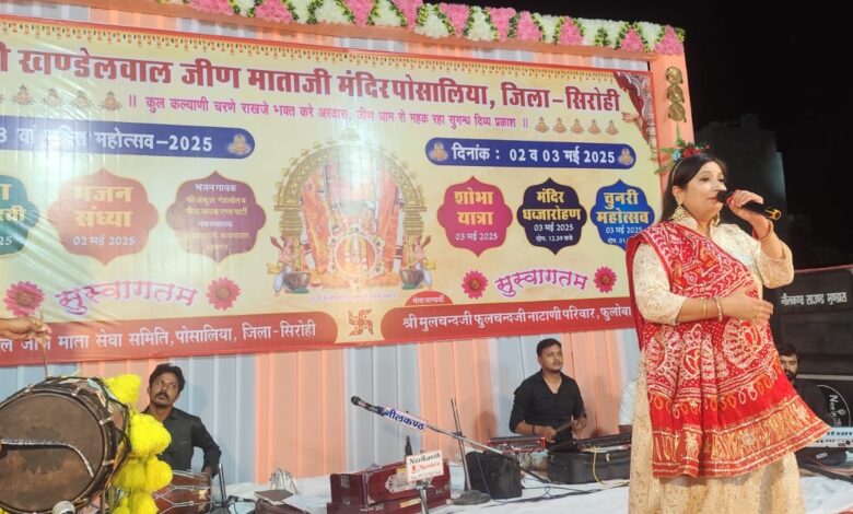 खंडेलवाल जीण माता सेवा समिति पोसालिया ट्रस्ट मंडल के महामंत्री लोकेश खंडेलवाल ने बताया कि शुक्रवार को भजन संध्या के साथ दो दिवसीय मेले का शुभारंभ हुआ। रात्रि भजन संध्या में मिलो उत्सव के लाभार्थी परिवार मूलचंद फूलचंद नाटाणी परिवार फूलों वाडी शिवगंज का ट्रस्ट की ओर से बहुमान स्वागत किया गया। इस अवसर पर मंदिर व्यवस्था के वार्षिक चढ़ावे भी बोले गए। भजन गायक अंकुश गहलोत एवं गायिका नीता नायक ने देर रात्रि तक माता के भक्तों को भक्ति में रंग में रंग कर एक से बढ़कर एक मैया को रिझाते हुए सुंदर रचनाएं पेश की । युवक युवतियों ने भजनों पर नृत्य कर अपनी भावनाओं का इजहार किया।