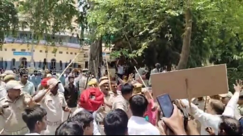 सुरक्षा के भारी जाब्ते में पुलिस उप अधीक्षक मुकेश चौधरी ने ग्रामीणो से समझाईश की। उसके बावजूद ग्रामीण धरने पर बैठने की कोशिश कर रहे थे। पुलिस ने न्यायालय परिसर में शोर गुल न हो तो ग्रामीणों को कलेक्ट्री गेट से साइड में बैठने के दिए निर्देश दिए पर आक्रोशित ग्रामीण नहीं माने तो पुलिस ने दिखाई सख्ती ओर ग्रामीण और पुलिस आमने सामने सामने हो गए।