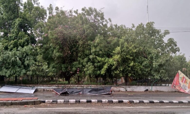 तेज अंधड़ के साथ बारिश,पेड़ व तीन बत्ती की रेलिंग उखड़ी।