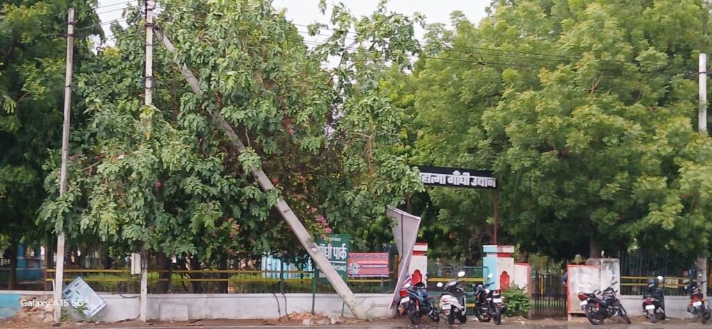 जहाँ अवैध तरीके से लगे लगे बड़े बड़े होर्डिंग में अंधड़ की हवा के भराव से विधुत पोल उखड़ा व होर्डिंग के साथ गांधी पार्क की दीवार की रेलिंग उखड़ गई।