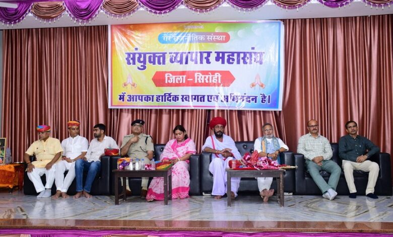 जिला स्तरीय संयुक्त व्यापार संघ सिरोही का स्नेह मिलन कार्यक्रम मुख्य अतिथि राष्ट्रीय व्यापार कल्याण बोर्ड भारत सरकार अध्यक्ष सुनील जे. सिंघी, राज्य मंत्री राजस्थान सरकार ओटाराम देवासी, जिला पुलिस अधीक्षक अनिल कुमार बेनीवाल, भाजपा जिलाध्यक्ष रक्षा भंडारी, आयकर अधिकारी दीपाराम घणदे, वाणिज्य कर हिन्दुसिंह सोडा, असिस्टेंट कमिश्नर स्टेट जीएसटी की अध्यक्षता में दीप प्रज्वलन के साथ प्रारंभ हुआ। कार्यक्रम में उपस्थित जनो को संबोधित करते हुए राष्ट्रीय व्यापार कल्याण बोर्ड अध्यक्ष सुनील जे सिंघी ने कहा कि व्यापारी किस स्थिति में अपने व्यवसाय करता है और भारत सरकार द्वारा किस योजना के तहत व्यापारियों को लाभान्वित किया जाता है जिसकी समुचित जानकारी राष्ट्रीय अध्यक्ष द्वारा व्यापारियों को दी गई कार्यक्रम में आये जिले के समस्त व्यापारियों द्वारा व्यवसाय करते समय किन-किन परिस्थितियों से गुजरना पड़ता है सभी की जानकारी अधिकारियों के सामने एक-एक कर साझा की।