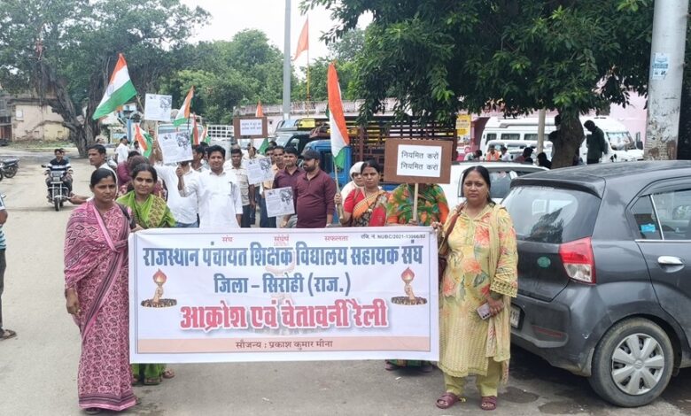 राजस्थान पंचायत शिक्षक विद्यालय सहायक संघ जिला सिरोही के बैनर तले जिला संयोजक चुनाराम परिहार, जिलाध्यक्ष शंकर राजपुरोहित एवं जिला महासचिव कैलाश डांगी के नेतृत्व में नियमितीकरण एवं अनुभव में दो वर्ष की छूट को लेकर चेतावनी रैली राम झरोखा मैदान से कलेक्ट्रेट तक निकाल कर सरकार का ध्यानाकर्षण करवाया गया। कलेक्ट्रेट में पहुंचकर अतिरिक्त जिला कलेक्टर को मुख्यमंत्री के नाम ज्ञापन सौंप कर आईएएस पैटर्न में 2 वर्ष की छूट एवं नियमितीकरण की प्रक्रिया आरंभ करने की मांग की गई । रैली के दौरान जिले के तमाम पंचायत शिक्षक विद्यालय सहायकों के हाथ में विभिन्न नारे लिखी हुई तख्तियां थी और जोर-जोर से नारेबाजी कर रैली निकाली गई । साथ ही अनुभव के आईएएस पैटर्न में 2 वर्ष की छूट का आदेश जारी नहीं होने एवं नियमितीकरण की प्रक्रिया जारी नहीं होने पर आक्रोश व्यक्त किया गया। इस दौरान संगठन के कोषाध्यक्ष कमलेश छिपा, ब्लॉक अध्यक्ष सिरोही अशोक सुथार, ब्लॉक अध्यक्ष पिंडवाड़ा ओमप्रकाश गरासिया, ब्लॉक अध्यक्ष रेवदर भरतकुमार पटेल, ब्लॉक अध्यक्ष शिवगंज सुरजीतसिंह देवड़ा, आबूरोड से शर्मिला शर्मा, लक्ष्मण परमार, सुरेश परमार , मोतीराम देवासी, कन्हैया लाल पुरोहित,भरत कोली, जगदीश धारावत, ताहिरा बानो, सीमा तोमर,रमा मिस्त्री, भगवानदास, सरूपसिंह, रानू बोडाना, मोनिका, खेमचंद मेघवाल, गोविंद माली, दिलीप सिंह समेत सैकड़ो की तादाद में पंचायत शिक्षक विद्यालय सहायक उपस्थित रहे।