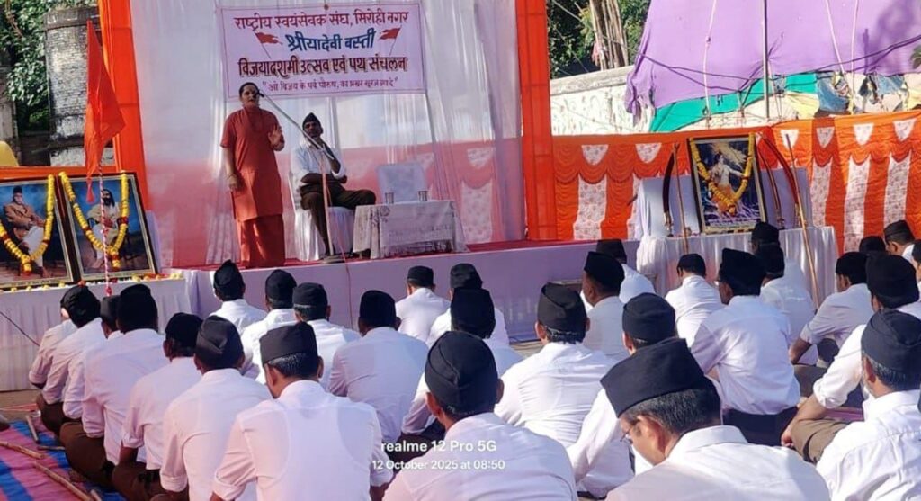 सरिया देवी बस्ती – सरियादेवी बस्ती में सुबह 9 बजे शस्त्र पूजन, बौद्धिक के बाद पथ संचलन रामझरोखा मैदान से आरम्भ हुआ जो कुम्हारवाडा,आर्यूवेदिक अस्पताल से होते हुए राजमाता धर्मशाला से होते हुए पुनः रामझरोखा पर समापन हुआ। इस बस्ती में मुख्य अतिथि डॉ संतोष कंवर बाईसा एवं मुख्य वक्ता नगर कार्यवाह कालूराम सिसोदिया का सानिध्य रहा। मुख्य वक्ता कालुराम सिसोदिया ने अपने बौद्धिक सत्र में कहा कि 1925 की विजयादशमी को प्रारंभ हुआ संघ आज अपने शताब्दी वर्ष में प्रवेश कर रहा है। उन्होंने कहा कि लगभग सौ वर्षों की यात्रा में संघ ने आलोचना भी झेली,प्रशंसा भी पाई। आज संघ न केवल भारत का, बल्कि वैश्विक हिंदू समाज का सबसे बड़ा संगठन है। यह केवल संगठन नहीं-एक जीवन शैली है,एक विचार है,और शायद, भारत की धड़कन भी। उन्होने कहा कि संघ समाज में निर्भीकता, सदाचार, धर्मनिष्ठा, देशभक्ति और समरसता के भावना के साथ कार्य करता है। संघ की जीवनशैली और संगठनात्मक दृष्टि समाज के लिए प्रेरणा दायक है।
