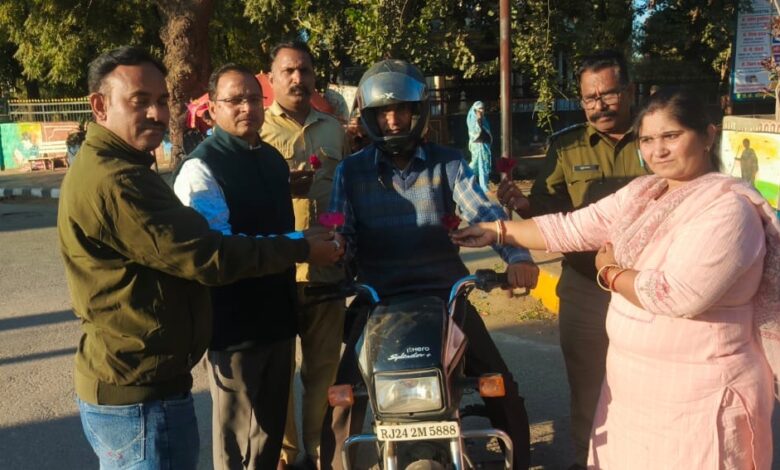 राज्य में सड़क दुर्घटनाओं की रोकथाम एवं सड़क सुरक्षा व्यवस्था को सुदृढ बनाने के उद्धेश्य से राज्य भर में 11 से 25 दिसम्बर तक 15 दिवसीय सड़क सुरक्षा अभियान शुरू किया गया है। जिसमें जिले में दुर्घटना संभावित स्थलों/प्रमुख मार्गों एवं गोयली चौराहा, अहिंसा सर्किल, जेल चौराहा, अनादरा चौराहा एवं परिवहन कार्यालय परिसर के सामने यातायात नियमों का उल्लंघन करने वाले वाहन चालकों की समझाइश तथा नियम पालना करने वाले चालकों को सम्मानित (फूल अथवा चॉकलेट इत्यादि देकर) किया गया। इसमें जिला परिवहन अधिकारी, अक्षमिता, परिवहन निरीक्षक जुहारमल मीना एवं परिवहन कार्यालय के कार्मिक उपस्थित रहे।