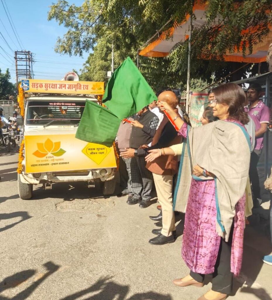 प्रदेश की सरकार के 2 वर्ष का कार्यकाल पूर्ण होने के उपलक्ष्य में राज्य सडक सुरक्षा प्रकोष्ठ, परिवहन एवं सडक सुरक्षा विभाग द्धारा सडक सुरक्षा जागरूकता अभियान 15 दिवसीय का जिला स्तरीय कार्यक्रम के तहत शनिवार को प्रातः अंहिसा सर्कल से जिला कलक्टर अल्पा चौधरी ने वाहन चालकों को सडक सुरक्षा प्रतिज्ञा की शपथ दिलाई, उन्होंने सडक सुरक्षा सारथी रथ के साथ बाईक व ऑटो रैली को हरी झंडी दिखा कर रवाना किया। इस रैली में सडक सुरक्षा अभियान के सीट बेल्ट लगाए, जीवन बचाए, वाहन चलाते समय मोबाईल का उपयोग न करें, सडक सुरक्षा नियमों का करों सम्मान, न होगी दुर्घटना, न होंगे आप परेशान इत्यादी स्लोगन वाली तख्तियों के साथ विभिन्न संदेश दिए गए।