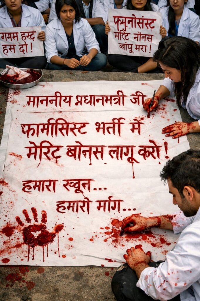 फार्मासिस्ट भर्ती मेरिट बोनस की माँग को लेकर आंदोलन और तेज, अब खून से लिखे पत्र केंद्र सरकार को भेजे जा रहे