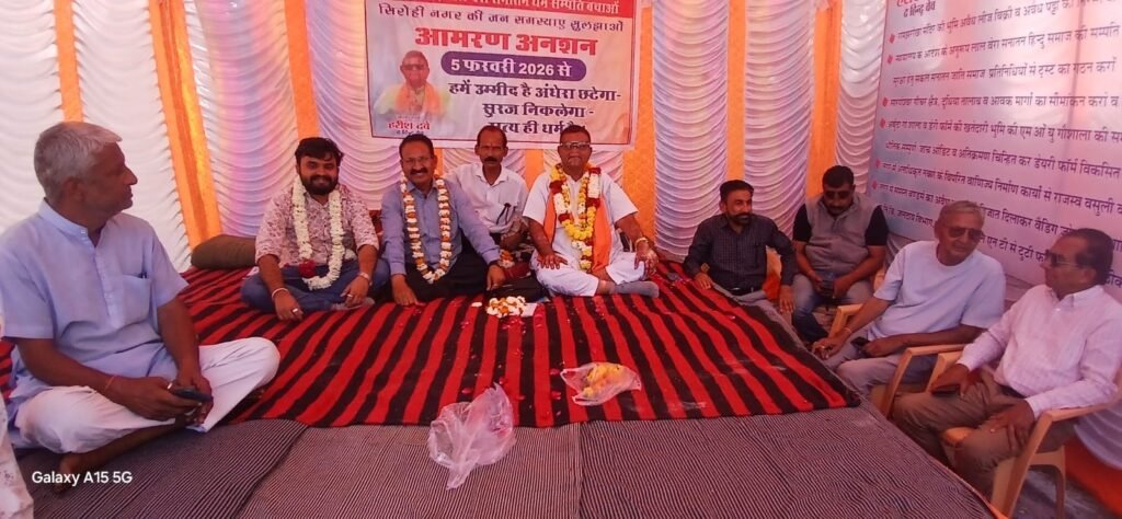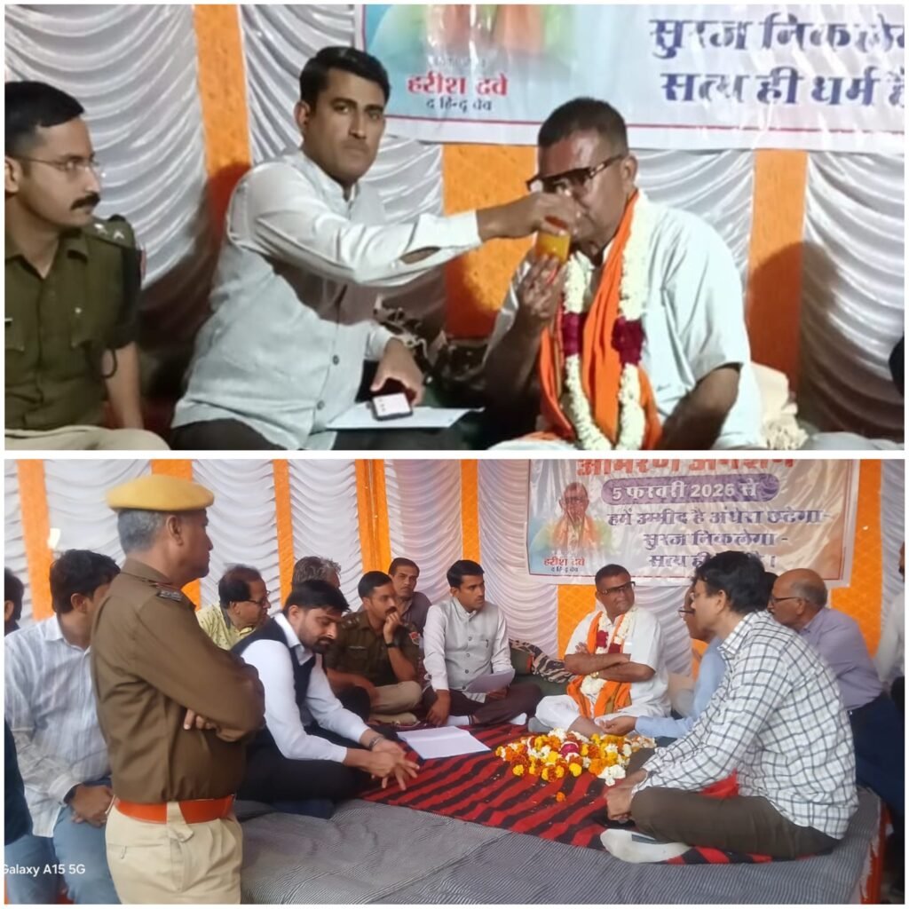 राम झरोखा मन्दिर पट्टा प्रकरण, लाल वेरा की सम्पत्ति पर न्यायालय के निर्देशों के बावजूद सनातन धर्म की कमिटी गठित नही होने, अर्बुदा, सारणेश्वर गोचर में अतिक्रमणों के खिलाफ कार्रवाई व बेशहरा गॉवंश की समस्याओं के समाधान के साथ कुल जन हित की सात मांगो को लेकर 5 फरवरी से आमरण अनशन पर बैठे हिन्दू वेव की जिला संयोजक हरीश दवे ने 9 फरवरी सोमवार से आमरण अनशन के साथ जल त्याग की चेतावनी के बाद जिला प्रशशन हरकत में आया व राज्य मंत्री ओटाराम देवासी व जिलाध्यक्ष डॉ रक्षा भण्डारी द्वारा भाजपा के प्रतिनिधिमंडल से वार्ता के बाद उपखंड अधिकारी हरीसिंह देवल, व पुलिस उपाधीक्षक मुकेश चोधरी व नगर परिषद सचिव श्री रमेश नगर परिषद कार्यालय के बाहर आमरण स्थल पर पहुचे ओर उन्होने अनशन कर्ता हरीश दवे व जनप्रतिनिधिमंडल समाज सेवी महावीरजैन, एडवोकेट अशोक पुरोहित, सुरेश सगरवंशी, शंकर सिंह परिहार, एनएस परिहार, नरेंद्र सिंह भाटी के साथ चली आधे घण्टे मंत्रणा के बाद उपखंड अधिकारी व पुलिस उपाधीक्षक से वार्ता व सातों मांगो पर सविस्तार चर्चा के बाद एडवोकेट अशोक पुरोहित व महावीर जैन की रामझरोखा, लालवेरा सनातन सम्पत्तियों पर गहरी वार्ता के बाद आमरण अनशन मार्च महीने तक स्थगित किया व उपखण्ड अधिकारी के सातो मांगो पर लिखित आश्वासन व सोमवार से तहसीलदार व सचिव नगर परिषद को निर्देशित कर स्वयं की मॉनिटरिंग में समुचित कार्यवाही का आश्वासन देने के बाद ज्यूस पीकर अनशन खुलवाया।