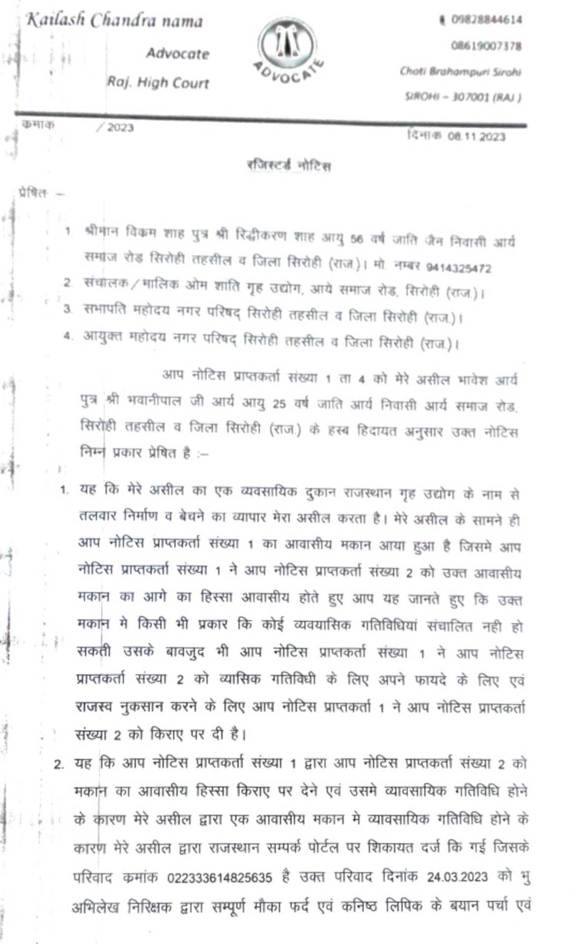 शहर के ऐसे कही स्थान है जहाँ भूमि स्वामित्व होने के बावजूद मकान मालिक भूमि को बिना वाणिज्य सम्परिवर्तन के अन्य लोगो को व्यवसाय के लिए भूमि किराय पर देते है जो अवैध है। मकान मालिक बड़ी बड़ी रक़म दुकान संचालक से अदा करता है। ऐसा ही मामला एक शहर के आर्य समाज रोड पर स्थित विक्रम शाह पुत्र रिद्धिकरण शाह का सामने आया है । उनके निवास स्थान पर दक्षिण कोणीय भाग में एक तलवार की दुकान संचालित है जो बिना संपरिवर्तन के संचालित है। जिसको लेकर भावेश आर्य पुत्र भवानी पाल आर्य निवासी आर्य समाज रोड ने कही बार संपर्क पोर्टल पर तथा नगर परिषद में मौखिक रूप से कही बार शिकायत करने पर भी कोई कारवाई नहीं की। बहुत दिन बीत जाने कि बाद नगर परिषद द्वारा 8 जून को नोटिश जारी किया। जिसपर भी खानापूर्ति कर आज दिन तक कोई कारवाई नहीं की गई। शिकायत कर्ता ने बताया की इतनी शिकायत करने पर भी कोई कारवाई नहीं हो रही लगता है बहुत बड़ा हाथ है एसी संभावना होने लगी।