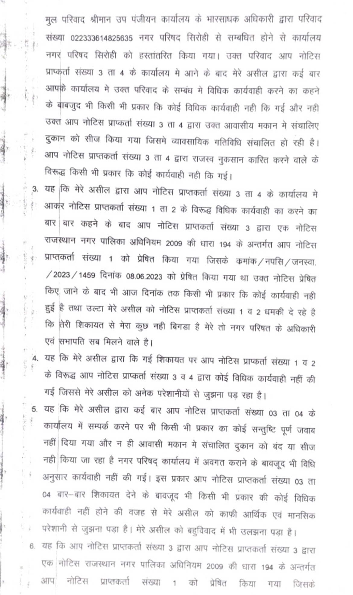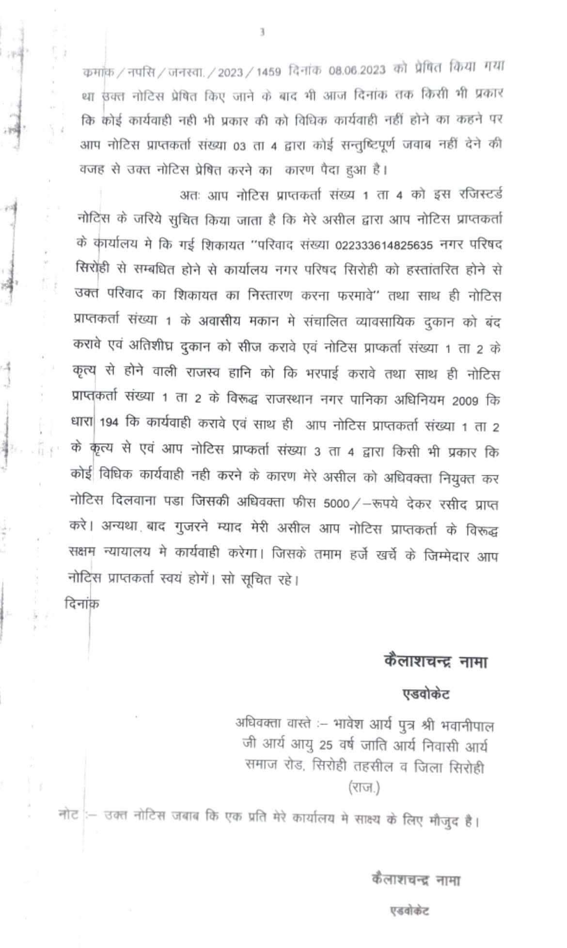 नगर पालिका से हार कर खटखटाया न्यायपालिका का दरवाज़ा। इतने महीने बीत जाने के बाद शिकायतकर्ता ने वकील के द्वारा दिया लीगल नोटिस। कहा उच्चित कारवाई करना फ़रमावे।